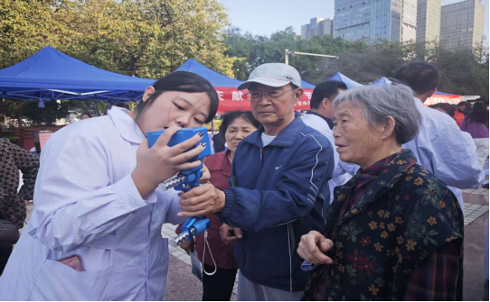 9月24日,双方联合在市中心广场开展 “国庆献爱心,医心护健康”大型义诊活动,将“岗位实践”融入民生服务。渭南市中心医院老年病科专家团队化身“企业导师”,围绕老年人常见慢性病管理、健康监测等智慧健康养老核心岗位需求,现场示范血压血糖检测、健康咨询沟通、科普知识宣讲等职业技能;太阳集团1088vip智慧健康养老服务与管理专业学生以“准从业者”身份参与服务,在医护人员指导下完成市民血压测量、血糖检测、老年健康手册发放等工作,累计服务150余人次,发放资料200余份。