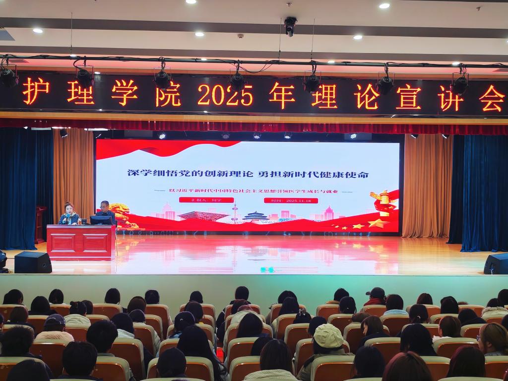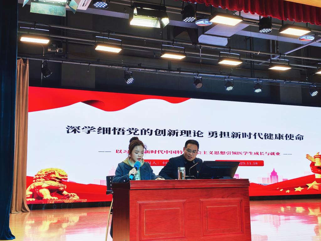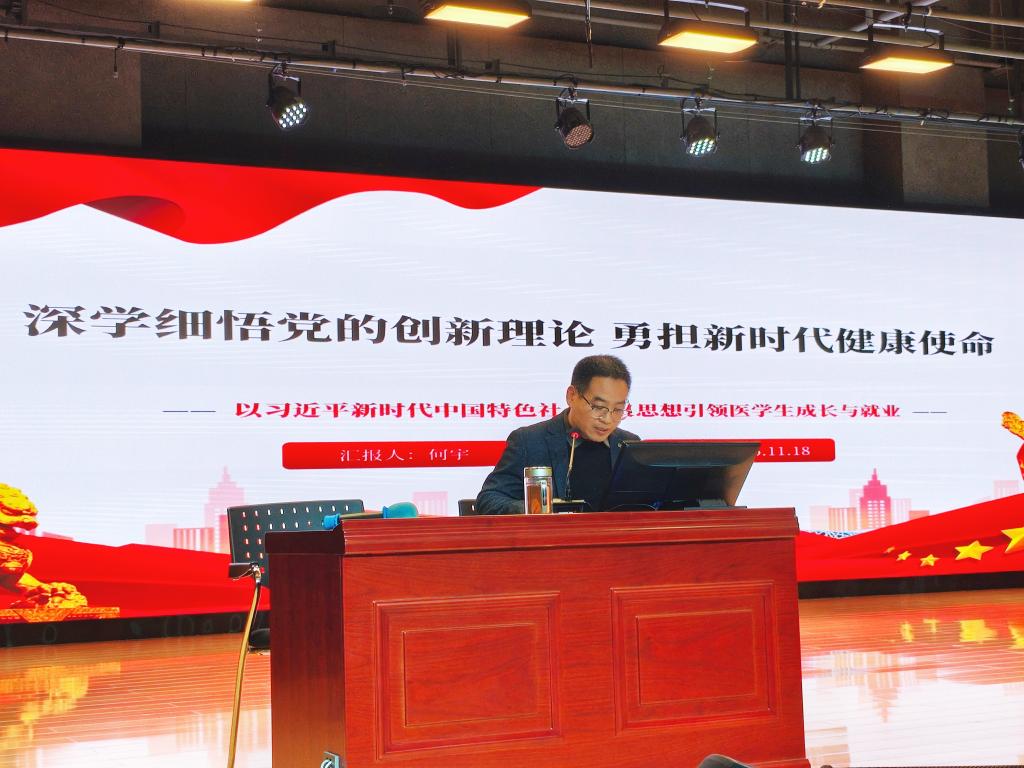 何宇以《深学细悟党的创新理论勇担新时代健康使命》为题,为在场师生带来一场内容翔实、富有启发的理论辅导。报告中,他系统阐述了党的创新理论对卫生健康事业的指导意义,强调“以人民为中心”是根本遵循,“健康中国”战略是时代使命,并紧密结合护理、临床、康复、养老等专业特点,引导大家将理论融入专业学习与职业塑造,坚守依法行医底线,弘扬“医者仁心”情怀。