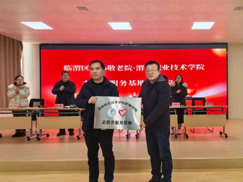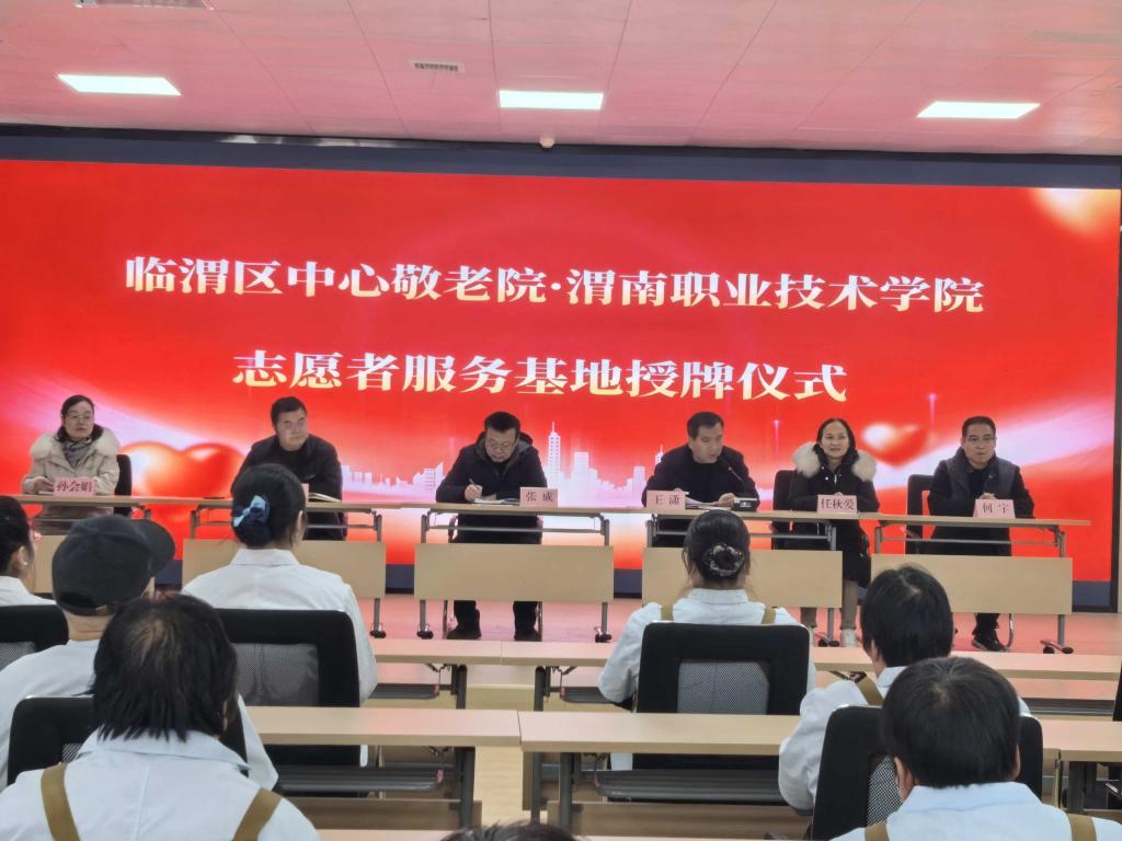 为进一步加强养老服务人才队伍建设,深化校地合作与产学共赢,推动职业教育资源服务地方发展,12月16日,太阳集团1088vip与临渭区中心敬老院举行“志愿者服务基地”授牌仪式暨座谈会。渭南市临渭区民政局党工委委员、副局长王潇,临渭区中心敬老院院长闵毅,太阳集团1088vip院长张成、副院长任秋爱、教学科副科长孙会娟、招生就业科科长何宇等参加了本次活动。